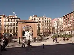 Its name remembers the Dos de Mayo Uprising in 1808 that marked the beginning of the Spanish War of Independence.[2] The plaza features a monumental arch in its centre dedicated to Luis Daoíz and Pedro Velarde, two soldiers fallen to the French army on 2 May 1808 who became heroes in the national imaginary.[2] The area was the place where the Monteleón Artillery barracks lied in 1808 and where the heroic defense of the aforementioned "martyrs" took place.[3]