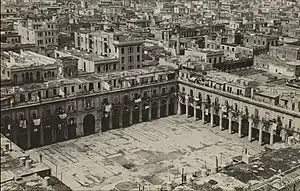 The building site is roughly square in shape, the building had a playground-courtyard in the middle[31] and an 8.3 metres (27 ft) high Colonnade surrounded by shops along the perimeter facing Calles Galiano, Reina, Aguila, and Dragones. The ground floor was commercial, the upper floors were occupied by the residences of some 200 families.[6] In 1840 the building was remodeled into its characteristic colossal mass of masonry arches comprising the height of the ground and second floor. On the front of Reina Street, the architect, Eugenio Rayneri Sorrentino, designed a central, square, domed turret with a four dial clock, the entrance to the courtyard.