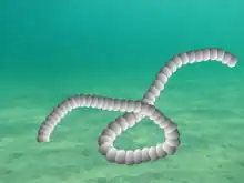 The fossilized organism is tubular and worm-like, with a body divided into rounded segments, making it look similar to a tapeworm with its long, laterally flattened body.[2][1] Its body appears to be bilaterally symmetric. The individuals range in size from 5 to 80 centimeters long and 5 to 20 millimeters wide.[2] The organism is composed of a rigid median tubular structure and a fragile outer tubular wall.[1]