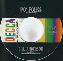 "Po' Folks" was released as a single by Decca Records in June 1960.[3] It spent a total of 14 weeks on the Billboard Hot Country and Western Sides chart before reaching number nine in February 1960. It was Anderson's second top ten hit as a recording artist. His first was his previous single release "Walk Out Backwards."[4] The song was not issued on a proper album following its release.[5] However, it was later released on his 1962 compilation entitled Bill Anderson Sings Country Heart Songs. The album featured his biggest hits for the first several years of his recording career.[2]