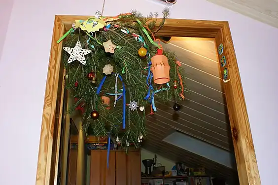 In Poland, the podłaźniczka was known mainly in the Goral Lands.[7] The podłaźniczka was made in various ways, it could be a conifer tree,[8] or conifer tree treetop[9] turned upside down, a branch of a conifer,[5] or a riddle (przetak) ring to which green twigs were attached.[5] So prepared decoration was attached to the beam,[8] often directly above the Christmas table,[8] or in a sacred corner.[9] Podłaźniczka is considered to be the prototype of modern Christmas tree in Poland.[10]