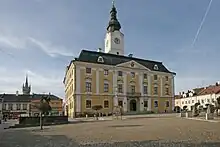 The historic centre is formed by Palackého Square and adjacentr streets. The square includes one of the most notable Baroque town halls in the country. It replaced an old Gothic town hall and was built in 1739–1744. The baroque 22-metre (72 ft) high Marian column was built in 1727–1731. Both the town hall and the Marian column were probably designed by the architect František Maxmilián Kaňka.[10][11]
