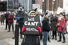 Water protectors have faced police brutality at the hands of militarized law enforcement. Notable cases include the Dakota Access Pipeline protests in 2016 when the Morton County sheriff's department (supplemented by officers from six states) attacked hundreds of water protectors with concussion grenades, tear gas, rubber bullets, and water cannons in sub-freezing temperatures.[82] They subjected water protectors to strip searches after arrest.[83] Energy Transfer Partners (the pipeline company) also employed a private security firm who used attack dogs and pepper spray against water protectors who were attempting to defend sacred burial sites from being bulldozed. Several water protectors were treated for dog bites. Police observed but did not intervene.[84][85]