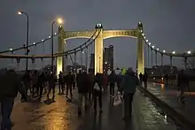 During the Vietnam War, anti-war demonstrations were sometimes quelled through the use of billy clubs and tear gas. One notorious assault took place during the August 1968 Democratic National Convention in Chicago. Some rogue police officers took off their badges, in order to escape identification, and brutally assaulted protesters. Journalists were assaulted inside the convention hall.[56] The actions of the police were later described as a "police riot" in the Walker Report to the U.S. National Commission on the Causes and Prevention of Violence.[57] On May 15, 1969, police opened fire on protesters in People's Park in Berkeley, California, which resulted in serious injuries for some protesters.[58] The 1970 Kent State shootings of 13 university students by the National Guard have been described as the culmination of such violent confrontations.[59]
