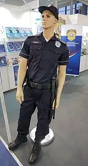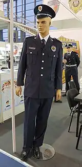 The current service uniform was adopted in 2013, replacing the previous uniform which dated from 2002. The dark blue outfit includes trousers (in summer and winter version), long- and short-sleeved shirts, a short- and long-sleeved polo shirts, sweater, two jackets (for transitional weather periods and for winter), raincoat, gloves, pair of shoes (in summer and winter version). Shirts, jackets and raincoats are with the POLICE (ПОЛИЦИЈА in Serbian Cyrillic alphabet) marking on the back side, while on trousers there are small POLICE (ПОЛИЦИЈА) markings on the side pockets. On shirt, sweater and jacket cloth police badge is worn on left breast while the name tag (along with identification number) atop the right breast; cloth police patch (varying depending of the uniformed police branch: general police, traffic police or border police) are embroidered on right shoulder sleeve. Headgear include soft cap with the emblem of the police at the front and small POLICE (ПОЛИЦИЈА) marking on the sides, and fleece cap (with the emblem of the police at the front) for winter period. There are some distinctive features depending of the specific directorate: traffic police wear yellow reflective vest with TRAFFIC POLICE (САОБРАЋАЈНА ПОЛИЦИЈА) marking on the back and smaller one on the right breast; border police shirts and jackets are all marked with BORDER POLICE (ГРАНИЧНА ПОЛИЦИЈА) marking on the back.[7]
