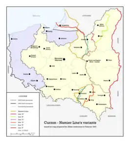 The Border Agreement between Poland and the USSR of 16 August 1945 established the borders between the Union of Soviet Socialist Republics (USSR) and the Republic of Poland. It was signed by the Provisional Government of National Unity (Tymczasowy Rząd Jedności Narodowej) formed by the Polish communists. According to the treaty, Poland officially accepted the ceding its pre-war Eastern territory to the USSR (Kresy) which was decided earlier in Yalta already. Some of the territory along the Curzon line, established by Stalin during the course of the war, was returned to Poland. The treaty also recognised the division of the former German East Prussia and ultimately approved the finalised delimitation line between the Soviet Union and Poland: from the Baltic sea, to the border tripoint with Czechoslovakia in the Carpathians.[1][2][3] The agreement entered into force on 5 February 1946.[4]