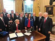As a presidential candidate, Trump was critical of the ways in which veterans are treated in the United States, saying "the vets are horribly treated in this country...they are living in hell."[155] He favored eliminating backlogs and wait-lists that had caused a Veterans Health Administration scandal the previous year. He claimed that "over 300,000 veterans have died waiting for care."[158] He said he believed Veterans Affairs (VA) facilities needed to be technologically upgraded, to hire more veterans to treat other veterans, to increase support of female veterans, and to create satellite clinics within hospitals in rural areas.[159] He proposed a plan for reforming the U.S. Department of Veterans Affairs with provisions to allow veterans to obtain care from any doctor or facility that accepts Medicare, to increase funding for PTSD and suicide prevention services, and to provide ob/gyn services at every VA hospital.[160] Trump called for greater privatization of veterans' care,[161] although his plan made no direct reference to letting veterans get health care outside the VA system.[161] The Wall Street Journal noted that "such a plan is counter to recommendations from major veterans groups, the VA itself and from the Commission on Care, an independent body established by Congress that last week made recommendations for VA changes."[161] Trump's plan calls "for legislation making it easier to fire underperforming employees, increasing mental-health resources and adding a White House hotline so veterans can bypass the VA and bring problems directly to the president."[161] Trump opposed the current G.I. Bill in 2016.[162][163]