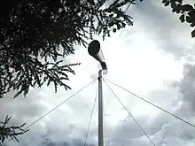 "The Horn" is a 24-metre (79 ft) high sculpture, located at the north-east corner of the country park, beside the M8 motorway. The stainless steel sculpture was commissioned by West Lothian Council, and was designed by artists Matthew Dalziel and Louise Scullion.[8] It was inaugurated on 21 November 1997 by Magnus Linklater, then chairman of the Scottish Arts Council. On windy days, the horn plays recorded music, poetry and famous quotes. The Horn could be classed as a speaker in itself, inside the bottom contains two 1990s Yamaha AX-596 Stereo Amplifiers which are connected to a device that automatically plays the content.