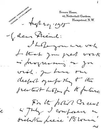 For the Polish Concert in July I composed an orchestra piece 'Polonia' as a small personal tribute to you; founded upon some Polish themes the work had success: in the middle section I have brought in remote & I trust with poetic effect a theme of Chopin & with it a theme of your own from the Polish Fantasia linking the two greatest names in Polish music – Chopin & Paderewski. I hope that you will one day hear the piece &, it may be, approve.