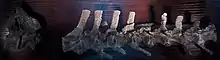 The centrum of the atlas vertebra is the only part preserved, and has a crescent shape and rounded anterior surface. The other two vertebrae have centra longer than they are tall. The axis has a triangular neural spine and relatively small prezygapophyses, at least compared to the stout postzygapophyses. The third cervical vertebra has an incomplete neural spine and equally sized post- and prezygapophyses. The caudal vertebrae have pronounced facets for the haemal arches, and tall plate-like neural spines. The centra have smooth convex ventral surfaces, and as the vertebrae are fairly large, they probably come from the anterior part of the tail.[2]