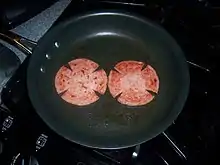 Pork roll is prepared by slicing it, if it is not already sliced, and then frying, searing, or griddling the slices.[2]