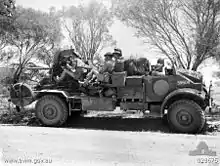 An Ordnance QF 6 pounder (57 mm) anti-tank gun mounted on a Bedford QLT 3-ton lorry or Austin K5 3 ton lorry. Both vehicles had a special frame-only body carrying the gun, crew, ammunition and the rarely used side shields. A F60 or C60 with cut down number 13 cab was similarly used.[7] The size and weight of the new gun led to it being dismounted before going into action more often than the smaller 2-pounder.[8]