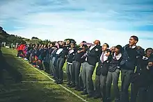 A group of Port Alfred High School students cheering for the first team rugby players using their war cry "die leeu" (the lion)