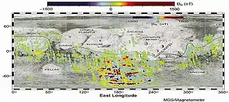 Map of the detected magnetic field on Mars, measured by Mars Global Surveyor.