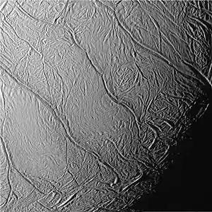 View of Saturn's moon Enceladus' South Polar Region, including four fractures informally named tiger stripes.
