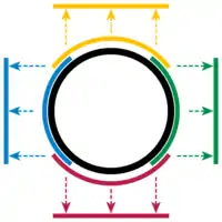 | The four charts each map part of the circle to an open interval, and together cover the whole circle. Image credit: User:KSmrq |
