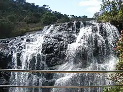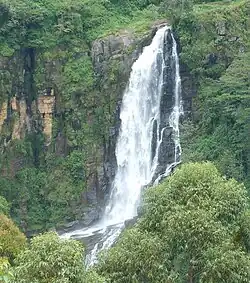 Elgin Falls is a waterfall in Sri Lanka, located in the Elgin tea estate which is 18km from the city of Nuwara Eliya, Sri Lanka. The waterfall is 25m in height. The falls draw their name from Elgin, Moray, a major town of Morayshire in Scotland. The falls are situated at about 1,900m above sea level. When traveling by railway between Nanu Oya and Ambewela, the falls can be seen picturesquely.