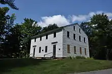The meetinghouse is a wood frame structure, 2-1/2 stories in height, with a side gable roof and a granite foundation. It is 44.5 feet (13.6 m) wide and about 36.5 feet (11.1 m) deep, with four bays on each side. The main facade first floor has doorways in the outer bays and windows on the inner bays, with sash windows in all of the remaining bays. There are also two smaller sash windows in the gable ends. The walls are clapboarded, and the roof is corrugated metal. The two doorways, each reached by granite steps, are flanked by pilasters and topped by four-light transom windows, with an entablature above.[2]