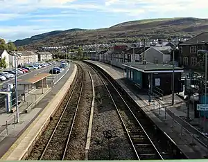 On 1 July 1876, the original station was closed, being replaced by a new one approximately 240 yards (220 m) to the east.[1] The Rhondda Fawr line to Treherbert was singled north of here in 1981 and most of the 1876 station buildings were replaced in 1984–85.[3]