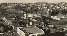 At its inception, the mill could produce 1,500 yards of wool per day.[7] By 1913, that number was nearly 60,000 yards per day.[8] During a large town-wide fire in 1905, the Portland Woolen Mills suffered US$300 worth (US$9,771 adjusted for inflation) of damage.[9] In 1913, the mill constructed a new 80 ft. by 200 ft. building on the site which cost US$600,000 (US$1,776,566 adjusted for inflation).[10] Vents in the roof were added to the entire building during the renovations. Lewis I. Thompson was the architect who designed the new building. During this time, the company decided to install a cafeteria and library for their employees.[8] The renovations allowed management to add 500 new workers which doubled their overall productivity.[11]