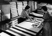During World War II, the United States federal government granted the Portland Woolen Mills contracts for wool blankets.[18] In 1943, the factory won an Army-Navy "E" Award for their production.[19] By 1950, the Portland Woolen Mills had become the largest wool manufacturer in the United States west of Cleveland, Ohio.[20] In 1951, the Portland Woolen Mills won a US$200,000 contract for the United States Armed Forces.[21] From its 1935 to 1952, the Portland Woolen Mills were led by executive director Charles H. Carter, who died two years after his retirement.[22] His son Charles H. Carter, Jr. succeed him in that position. In 1960, the Portland Woolen Mills announced it would cease operations. At the time of the closure, the factory employed 100 people. Carter cited increasing production costs due to foreign competition as the reason he closed the mill.[23]