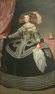 Velázquez seemingly conducts an in-depth examination of Mariana's character.[22] She is depicted as elegant and extravagantly dressed in the height of contemporary fashion, but with a sulky expression. According to Hagen, Mariana felt constricted by the demands of court, and suffered from "boredom, loneliness, home-sickness and illness in consequence of her never ending pregnancies [which] transformed the lively girl into that willful, mulish German".[9] Her pout reappears in several of Velázquez's later portraits, including Juan Bautista Martínez del Mazo's 1666 Mariana of Spain in Mourning, painted just after her husband died and the year her daughter Margarita, then twelve, was sent to marry her uncle, Emperor Leopold I.[23]