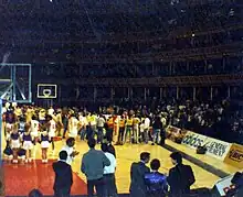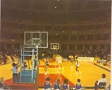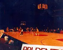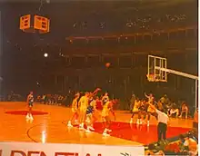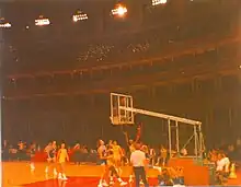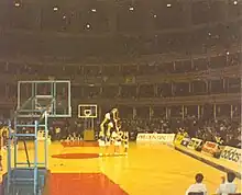 Portsmouth (in blue) at the free-throw line against Crystal Palace in the last game played on the Mountbatten Centre's carpet court, 26 March 1986