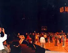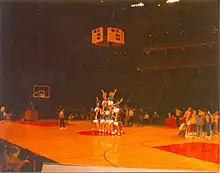 Portsmouth's cheerleaders form a pyramid during a time-out against Kingston, 15 December 1986