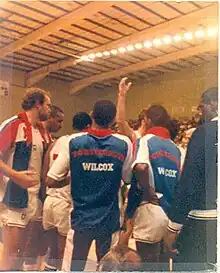 Mike Spaid, left, listens in as Portsmouth take a time-out against Calderdale, 30 November 1986