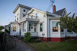 The house is a timber-frame house that was originally constructed on the west side of Pine Street, but its original form is not known for sure due to the extent of its expansion and remodeling. The NRHP nomination states that it could have been a 1+12-story gabled roof cottage with a cross-gable in the center, a style popular during the mid-century in Pawtucket. This original structure retains little of its form except for the Gothic hood moulds on the second floor end windows and the Gothic bargeboards. A two-story hipped roof addition was constructed in two phases, one completed before 1877 and the other between 1895 and 1902. Though the NRHP also states that the original house was enlarged in the late 1860s or 1870s without specification to the work done at the time. The additions include a bay window on the facade and openwork on the porch sides. The later alterations to the building worked to complement the distinctive bargeboards of the cottage with the work on the eaves and window heads of the addition.[3]