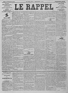 Front page cover of the newspaper Le Rappel of 30 August 1876, with the text Pour la Serbie, written by Victor Hugo about the massacres committed against the Serbs.