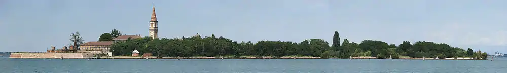 The surviving buildings on the island consist of a cavana, a church, a hospital, an asylum, a bell-tower and housing and administrative buildings for the staff. The bell-tower is the most visible structure on the island, and dates back to the 12th century. It belonged to the church of San Vitale, which was demolished under Napoleon's orders in 1806. The tower was re-used as a lighthouse.