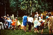 Midsummer dance to prästens lilla kråka in Årsnäs in Sweden in 1969. The participants are about to throw themselves towards the midsummer pole.