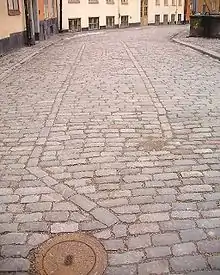 The extension south of Tyska Stallplan was named Stenbergs gränd ("Alley of Stenberg") after Crown Equerry Antonius von Steinberg (–1675), favourite of Queen Christina (1626–1689) and owner of the entire block north of the extension.[1] The painter Carl Larsson (1853–1919) was born in a building nearby.[2] The arrangement of paving stones in the street on the southern slope show the extent of the Blackfriars monastery located on the northern side of the street from the coronation of King Magnus Eriksson in 1336 to the Reformation (around 1520–1530). An archaeological excavation in 1993 revealed the corner of a wall 0.6 metres under the current street just in front of the corner between Tyska Stallplan and Prästgatan.[3]