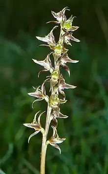 Prasophyllum wilkinsoniorum is a terrestrial, perennial, deciduous, herb with an underground tuber and a single bright green, tube-shaped leaf, 300–400 mm (10–20 in) long with a white to reddish base. Between fifteen and forty five flowers are arranged along a flowering spike up to 450 mm (20 in) high. The flowers are dark greenish-brown to brownish-red and scented. As with others in the genus, the flowers are inverted so that the labellum is above the column rather than below it. The dorsal sepal is egg-shaped to lance-shaped, 8–11 mm (0.3–0.4 in) long, about 4 mm (0.2 in) wide and turned downwards. The lateral sepals are linear to lance-shaped, 8–11 mm (0.3–0.4 in) long, about 2 mm (0.08 in) wide and the petals are linear to narrow lance-shaped, 8–12 mm (0.3–0.5 in) long and about 2 mm (0.08 in) wide. The labellum is green to pinkish, broadly egg-shaped to lance-shaped, 7–9 mm (0.3–0.4 in) long, about 5 mm (0.2 in) wide and turns sharply upwards with wavy edges. There is a fleshy green to brown callus in the centre of the labellum. Flowering occurs from December to January.[2]