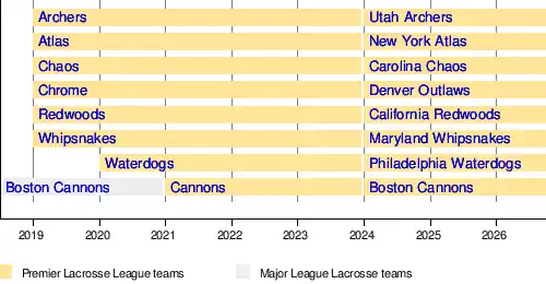 As of the 2024 season, eight clubs with rosters of 25 players each compete in the Premier Lacrosse League, divided equally into two conferences.[27] The Eastern Conference consists of the Boston Cannons, Maryland Whipsnakes, New York Atlas and Philadelphia Waterdogs, while the Western Conference consists of the California Redwoods, Carolina Chaos, Denver Outlaws and Utah Archers.[28] Six of the current teams have competed in the league continuously since the inaugural 2019 season.[29][30] The Waterdogs were admitted as an expansion team in the 2020 season,[31][32][33] while the Cannons moved from Major League Lacrosse (MLL) and began play in the 2021 season.[34][35] The Cannons were the only MLL club to survive the MLL–PLL merger,[35] though the Outlaws, originally founded as the Chrome Lacrosse Club, adopted the identity of the MLL's Denver Outlaws.[36][37][38] The Maryland Whipsnakes are the most successful franchise, having won two championships and finished runners-up once.[39][40] The Archers, Chaos and Waterdogs have each won one championship.[40][41] The Redwoods finished runners-up once, while neither the Atlas, Cannons or Outlaws have yet appeared in a PLL Championship game.