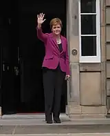 Nominations for the SNP leadership closed on 15 October, with Sturgeon confirmed as the only candidate.[11] SNP convener Derek Mackay publicly congratulated Sturgeon as de facto leader in waiting, saying that she would be "a fantastic new leader" for both the SNP and for Scotland.[12] On this date, Sturgeon also came out on top in a trust rating opinion poll, conducted for the SNP, which indicated that 54% of the Scottish population trusted her to "stand up for Scotland's interests".[13] She was formally acclaimed as the first female leader of the SNP on 14 November 2014 at the Autumn Conference in Perth, with Hosie as her depute.[14][15] This also made her first minister-designate, given the SNP's absolute majority in the Scottish Parliament.[16] In her first speech as leader, Sturgeon said that it was "the privilege of her life" to lead the party she joined as a teenager.[17]