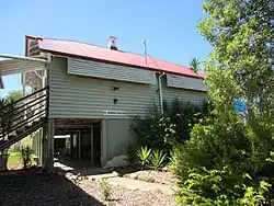 The immediate post-World War II years were a time for improvements. Estimates for the erection of a tennis court of £40-50 were received in 1946, but it was not until a working bee in April 1951 that the tennis court was completed.[35] Meanwhile, on 31 July 1948, an honour board with the names of those from the district who served in WWII was unveiled. Constructed by Frank Olkers of Lowood, the honour board was erected by the School Committee and funded by Prenzlau Progress Association.[36] A report of the unveiling event stated that all those listed on the board were past scholars of the Prenzlau School. In 1949 the exterior of the school was painted.[37] Electricity was connected to the school in September 1952.[38] The roof was replaced after cyclonic winds unroofed the school in June 1954; and the northern portion of the east verandah was enclosed to house a library in 1959.[39] In this year also, a new teacher's residence was built (removed post-2005) and the old residence demolished.[40] In 1962 at a cost of £40, alterations to the school included resurfacing of the tennis court.[41][1]