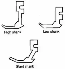 A diagram of the three principal types of presser feet— the high-shank foot, the low-shank foot, and the slant-shank foot— used in domestic sewing machines