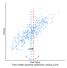 If the covariance between fitness () and trait value () is positive, the trait value is expected to rise on average across population . If the covariance is negative, the characteristic is harmful, and its frequency is expected to drop.