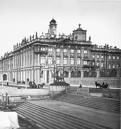 The Private Apartments of the Winter Palace are sited on the piano nobile of the western wing of the former imperial palace, the Winter Palace in St Petersburg. Access to the private rooms, for members of the imperial family, from the exterior was usually through the Saltykov Entrance (centre in the photograph to the right) which was reserved for use by only the Tsar, Tsaritsa and grand dukes and grand duchesses. A second access was through a discrete box-like porch, on the western end of the palace's Neva façade. From the ground floor, it can be accessed from the October Staircase, formerly known as His Majesty's Own Staircase; this double-flighted imperial staircase was a secondary entrance to the private apartments, and provided a more convenient route to the palace's ground floor and private entrances than the more formal and ceremonial public route through the state apartments. During the October Revolution of 1917, this was the entrance by which the revolutionaries gained access to the palace in order to arrest the Provisional Government in the small private dining room. Since that date it has been known as the October Staircase and has a plaque commemorating the event. Despite its size and grandeur, the October Staircase was a secondary staircase, the Jordan Staircase being the principal.[1]