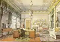 The former study or boudoir (4 on plan) of the Tsaritsa Alexandra Feodorovna (wife of Nicholas II) was redesigned for her by Alexander Krasovsky between 1894 and 1895. The room had previously formed the private suite of the wife of Nicholas I when, as her boudoir, it was decorated in red. For Nicholas I, devoted to his wife, spending an evening in this room with her was one of his favourite pastimes.[23]