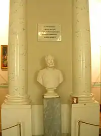 It was here, in March 1881, that the fatally wounded Alexander II was carried to die (on the chaise longue to the right of the picture). Following his death a memorial bust was placed on the spot where he died; this remains in place today.[10] The room, like many of the private rooms, is accessed from the aptly named "dark corridor." It was along this long passageway that Maria Fedorovna in her memoirs talked of following great drips of congealed blood to find the dying Tsar in his study.[11]