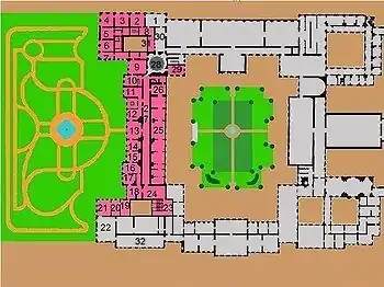The Tsaritsa also created the private garden (35) beneath the windows of the private apartments on the site of a former parade ground.[8] Before this, the only garden of the palace was the very overlooked one (32) created in the palace's principal courtyard for her mother-in-law a few years earlier. These two areas remain the only gardens of the palace.