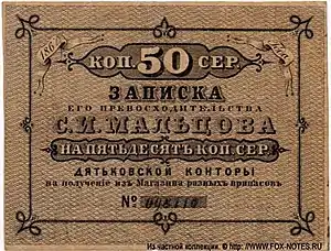 In the early 1860s Maltsov's "notes" were not only readily accepted by neighboring landlords as a quitrent, but also when paying various state taxes. Maltsov "notes" cease to be simply coupons for getting products from factory warehouses, prepared for future use by the plant management. They become a means of circulation in the trade of neighboring counties. Mentioned "money paper signs, circulated on local markets on a par with government money" and in an essay by N. Sakharov, dedicated to memories of the Kaluga governor.
