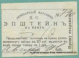 In Russia, consumer organizations emerged after the abolition of serfdom. The first was Riga, whose articles of association was approved in 1865. In 1901, 577 companies were registered, and by 1917 there were 23 thousand of them, comprising 6.8 million shareholders. Most of Russian consumer organizations worked by the "discount" model, meaning they were making an agreement with the entrepreneurs for selling their good to the shareholders of consumer organizations for a lower price. The board of the company produced special paper or metal tokens of different denominations, which supplied its members. This accounted for the amount of purchases goods of each shareholder.[11]