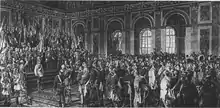 In 1870, von Werner spent the final phase of the Franco-Prussian War at the headquarters of the Third Army led by Prussian crown prince Frederick William. In January 1871, the latter asked him to travel from Karlsruhe to the "Grand Headquarter" in the Palace of Versailles to "experience something worthy of your brush."[1] Von Werner was only informed of the Proclamation of the German Empire on 18 January. The crown prince had impressed the design of the Palace of Versailles, which presented itself to visitors as a national site of fame in France, furnished with historical paintings. He wanted something similar for Berlin, but, unlike Napoleon Bonaparte, he had not come to the idea that the imminent ceremony would be designed by the painter for posterity. Napoleon had allowed Jacques-Louis David to stage the furnishing and the appearance of the actors in his imperial crown for a historical painting.[2]