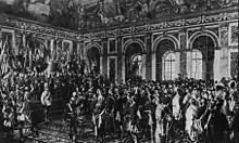 The Prussian ceremony in the Hall of Mirrors was short and simple. In the elongated gallery stood, on the window side, Prussian and Bavarian soldiers and on the mirror side, their officers, mixed with some other southern German armies. The King, accompanied by German princes and his entourage, crossed the trellis to the middle, where a field altar was erected. There, a Potsdam army chaplain celebrated a worship service, during which the chorus sang "Nun danken alle Gott" (Now Thank We All Our God). Then, the group went to a flat platform at the end of the gallery, where the princes and William stood in the middle. Bismarck, who stood below surrounded by commanders, read the imperial proclamation. Thereupon, the Grand Duke of Baden issued a "Hoch" ("Hurrah") to "His Majesty Emperor William", which those who were in attendance repeated three times. The ceremony was over, while the calls continued among the troops stationed in the palace and the park.[3]
