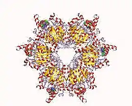 - 1 2 3 Huang CS, Sadre-Bazzaz K, Shen Y, Deng B, Zhou ZH, Tong L (August 2010). "Crystal structure of the alpha(6)beta(6) holoenzyme of propionyl-coenzyme A carboxylase". Nature. 466 (7309): 1001–1005. doi:10.1038/nature09302. PMC 2925307. PMID 20725044.