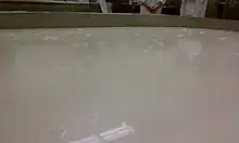 Pasteurized milk being held in bulk heating tank for cheese making.
